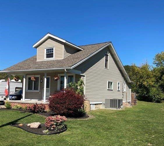 This lovely home rests on a unique piece of paradise – extended lot to stretch out on and no rear neighbours. Oversized open concept family room, kitchen, eating area. Laminate and ceramic throughout. Newer renovated kitchen with stainless steel appliances – fridge, gas stove, dishwasher for your convenience. Large breakfast bar and plenty of cabinets and counterspace. Main floor bedroom, laundry room w/washer, dryer and mud room off rear yard area. Upper loft hosts 2 bedrooms, 2nd bath, wrought iron railing and hardwood steps/ flooring throughout 2nd level. Open area in upper loft between bedrooms for den/computer space. Peaceful rear wooden deck with loads of trees to sit w/gas barbq hook up, 2 sheds w/power, heat & ac. Follow the lane that opens up to George Avenue park with greenspace including playground and baseball diamonds. Great home toward lifestyle to include mobile work set up.